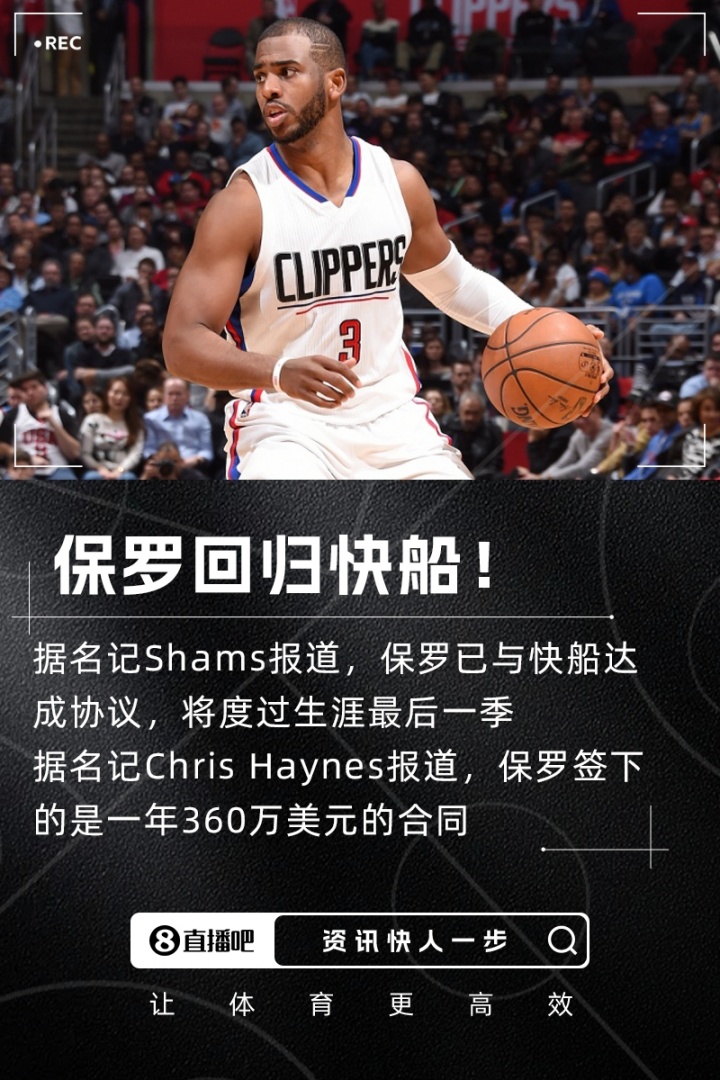 据名记Chris Haynes报道,保罗签下的是一年360万美元的合同。