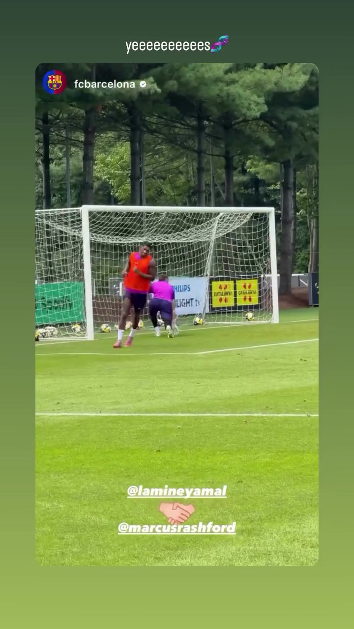 亚马尔在队内训练中为拉什福德送出传球,后者凌空破门,亚马尔社媒转发视频。
