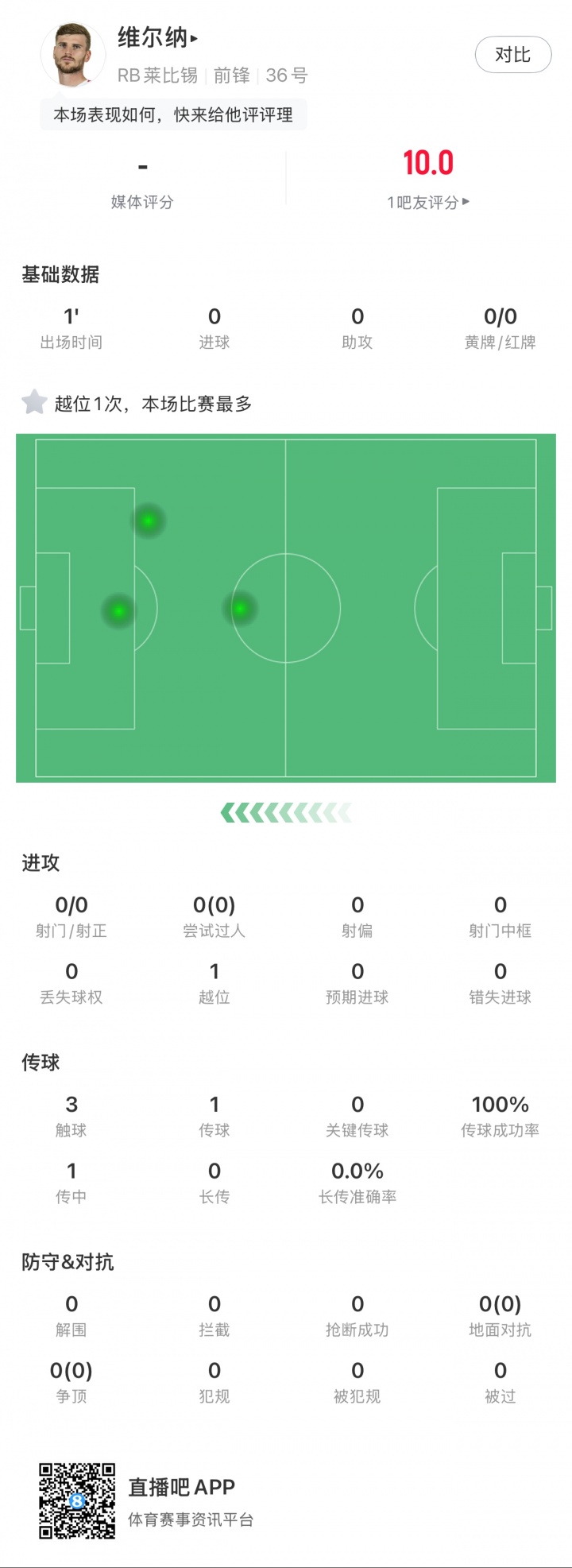 年薪1000万!维尔纳替补出战3分钟,挡出队友射门并完成一次越位