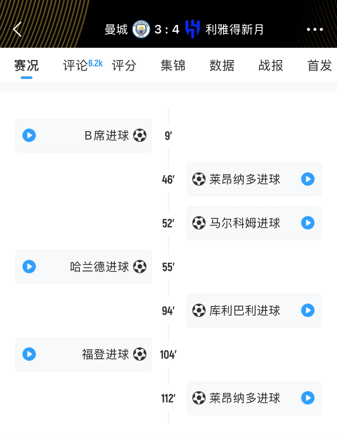 本场比赛跌宕起伏!常规时间曼城方面哈兰德、B席破门,而新月方面莱昂纳多、马尔科姆破门。